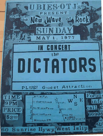 On this day in 1977, the Dictators took the Belt out to Lung Island for this gig at Ubies. I’d bet a bomb pop that the “Guest Attraction” was either the Good Rats or Twisted Sister, since Ubies was a regular spot for both bands. The rumor remains unconfirmed that Ritchie Teeter and Mark the Animal, both native LI’ers, had to translate for the evening.
