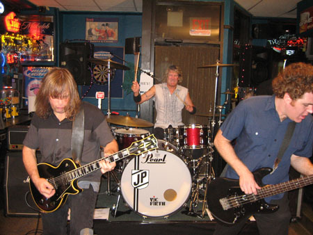 Salvi and I found our way to BillyMarks, strolling in the door as the band did a brief soundcheck. Mid-song, J.P. spotted Salvi, and yelled “SAL!” After finishing the check, J.P. came over to chat and thank us for traveling so far for his little bash. Not a problem, Mr. Bolt. As J.P. worked the room, we spoke quite a while with Dean, Ross and C.J. Sciøscia. J.P.’s daughter filled snack bags with crunchies, while his wife sold T-shirts and CDs, and searched for gaffer’s tape. Once behind his drumkit, J.P. explained that he and his missus were on the eve of their 17th wedding anniversary … awwww.
